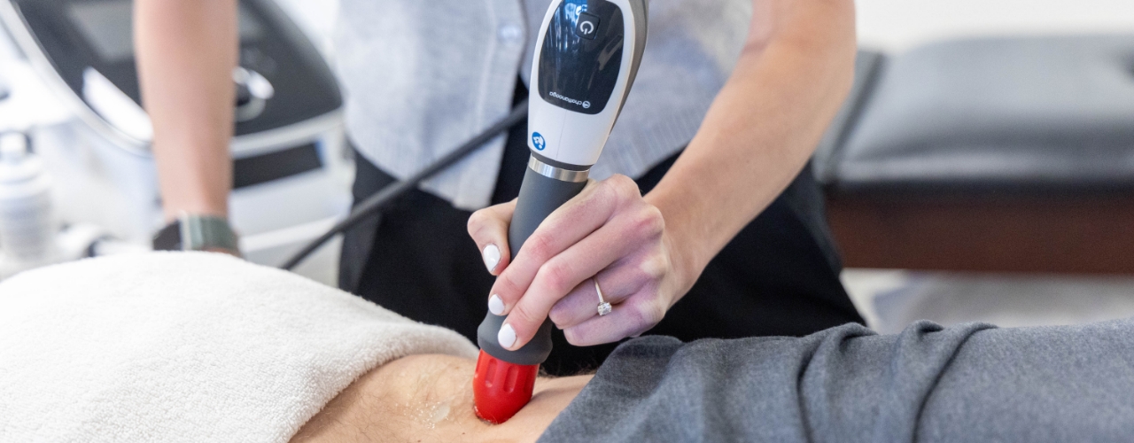 Shockwave therapy is a physical therapy modality that sends acoustic shock waves into soft tissue to positively affect the healing process at a cellular level and simultaneously breaks up adhesions that can restrict mobility in tendons or other soft tissues in the body.